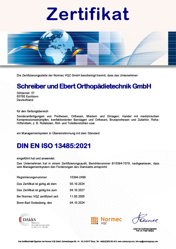 Die Orthopädie-Technik Schreiber & Ebert GmbH ist nach DIN EN ISO 13485 zertifiziert.